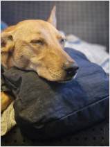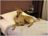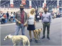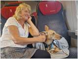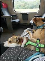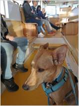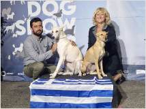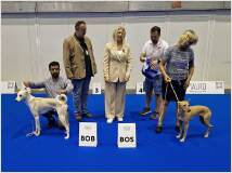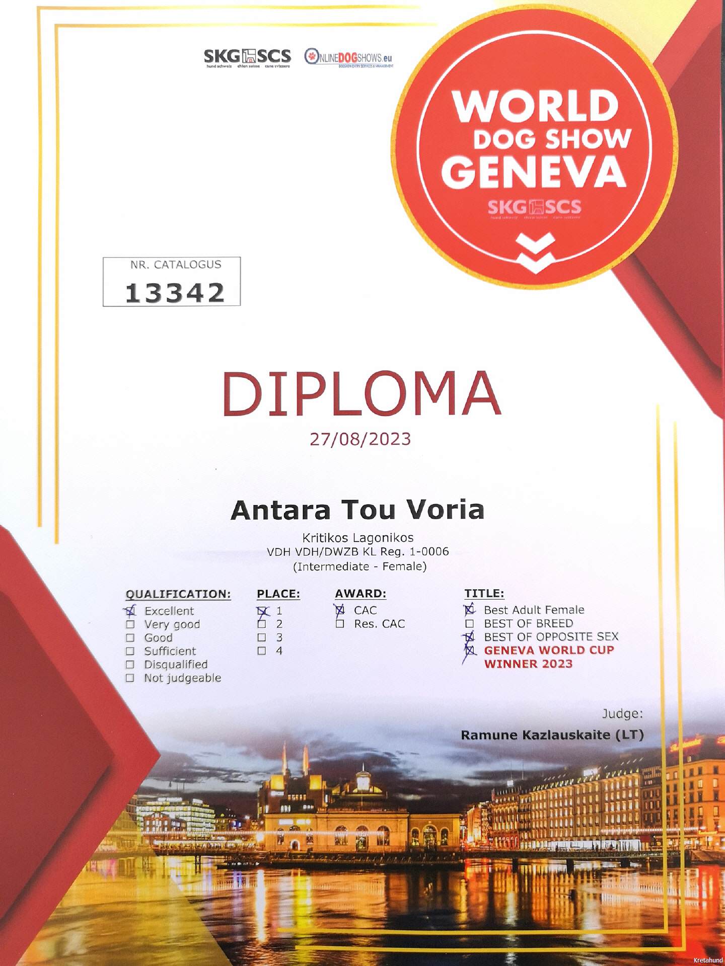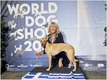 Auf der Zuchtschau des Kritikos Lagonikos Club auf Kreta am 3. Juni hatte der Rüde "Peristeris" von Giannis Perrakis den Förderpreis des Griechischen Kennel Clubs KOE gewonnen, um an der WDS teilnehmen zu können. Ich hatte zu dem Zeitpunkt bereits Antara gemeldet, und so konnten wir dort diese beiden Hunde als Vertreter der Rasse Kritikos Lagonikos präsentieren. Da der Besitzer des Rüden es terminlich nicht einrichten konnte, mit seinem Hund nach Genf zu fliegen, übernahm der Vorsitzende des OKLA, Nikos Anetakis, begleitet von Charis Arvanitis, diese Aufgabe. Auch für Antara und mich war es eine lange Anreise zu dieser Veranstaltung. Gemeinsam mit Antaras Jugendfreundin, dem Lundehund Margret (Brightness of Aurora Alluring Margret) und ihrer Besitzerin ging es mit der Bahn nach Genf, aus dem hohen Norden Deutschlands eine Fahrt von 13 Stunden. Ein Zimmer in einem hundefreundlichen Hotel mitten in der Stadt hatten wir rechtzeitig gebucht. Von dort aus war es am nächsten Morgen noch eine kurze Fahrt mit dem Bus zur Ausstellungshalle Palexpo nahe des Flughafens. Über 20.000 Hunde wurden dort an 5 Tagen vorgestellt, es wurde in 80 Ringen zeitgleich gerichtet. Die national anerkannten Rassen waren am Sonntag dran und hatten einen eigenen Showring, der viel Aufmerksamkeit von Seiten der Zuschauer und der Medienvertreter anzog - konnte man hier doch seltene Hunderassen sehen, die man sonst nie zu Gesicht bekommt. Es ging sehr international zu, um uns herum waren Hundefreunde aus Australien, Kasachstan, Rumänien, Polen usw., um ihre ungewöhnlichen Hunde zu zeigen. Eine Ausstellung in einer Halle, noch dazu in dieser Dimension, war für die 18 Monate junge Antara ungewohnt, zumal auch Fahrten in Bus und Bahn, der Aufenthalt im Hotel und in einer Großstadt für sie bis dahin völlig unbekannt waren. Trotzdem meisterte sie alle Aufgaben entspannt und gut gelaunt, aber im Ring fühlte sie sich nicht wohl und war froh, als sie ihn wieder verlassen durfte. Die Richterin, Ramune Kazlauskaite aus Litauen, bewertete sie mit Excellent 1 und verlieh ihr als beste Hündin der Rasse die Anwartschaft auf den Schweizer Champion CAC und den Titel "World Cup Winner 2023".