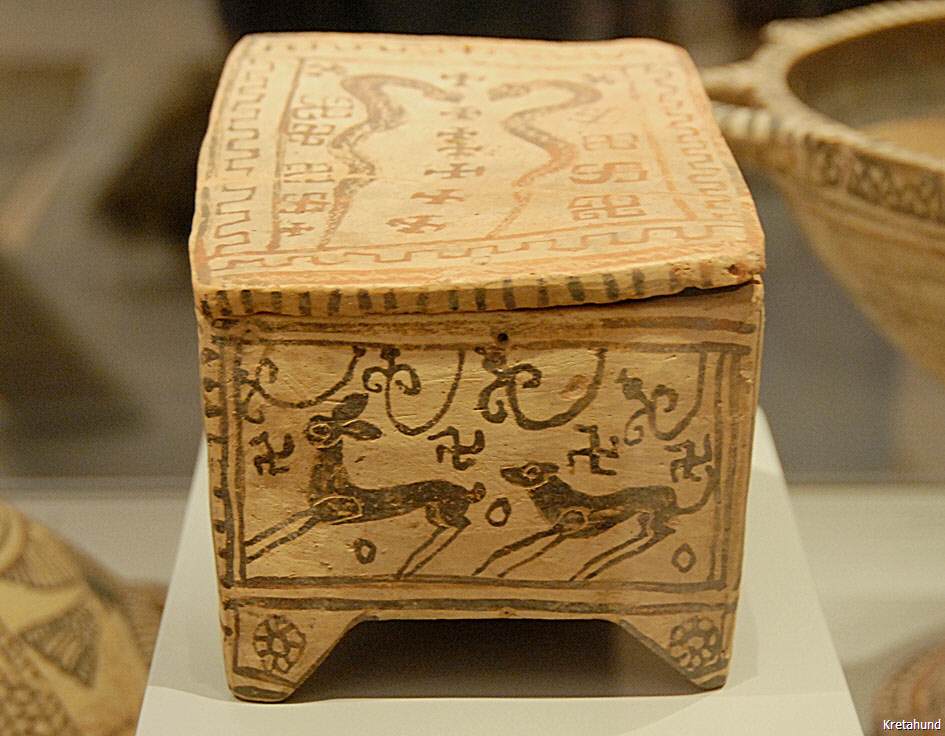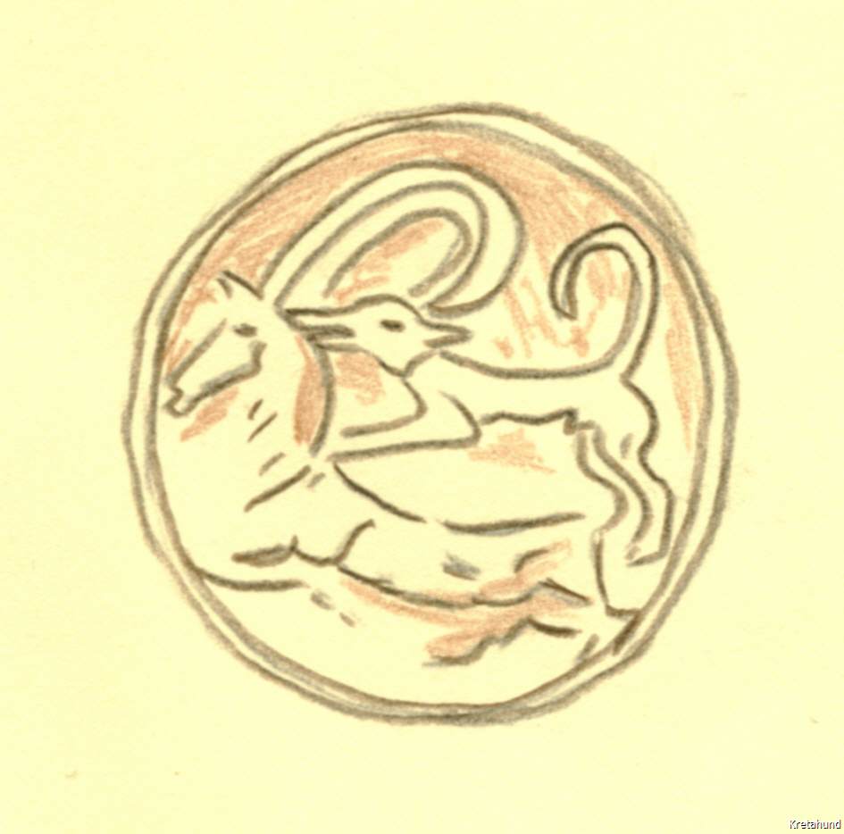 Handelt es sich um die Rassenklassifikation, so kann es gar keinem Zweifel unterliegen, dass wir es mit einem echten Windhund zu tun haben, der einen primitiven Charakter bewahrt hat. Ebenso sicher ist es, dass er mit dem früher von mir beschriebenen Ibizahund der Balearen-Inseln nahe verwandt, ja geradezu identisch ist. Schlechter gehaltene Balearenhunde lassen sich hinsichtlich der äußeren Erscheinung und dem Benehmen kaum vom Kreterhund unterscheiden. Beide haben ihr Stammland im Niltal. Es sind lebende Reste der alten Pharaonen-Windhunde, die sich kaum verändert haben. Während wir bisher nur die Relikten-Kolonie auf den Balearen kannten, kommt jetzt eine zweite in Kreta hinzu. Verfolgen wir die Geschichte der Rasse nach rückwärts, so erkennen wir, dass ihre Blütezeit in die zweite Hälfte des ersten vorchristlichen Jahrtausends fällt. Die Kreterhunde waren im Altertum berühmt und kamen vielfach nach Griechenland hinüber. Wir besitzen vorzügliche bildliche Darstellungen derselben. Sie finden sich auf altkretischen Münzen, insbesondere auf Münzen des antiken Kydonia. Der Sage zufolge soll sogar der Gründer dieser Stadt in seiner Kindheit von einer Kreterhündin gesäugt worden sein. Wie mir der berühmte Numismatiker Imhoof-Blumerbrieflich mitteilt, reichen diese altkretischen Münzen hinsichtlich ihres Alters nicht über das Jahr 500 v. Chr. hinauf. Eine reiche Auswahl derartiger Münzen mit schönen Windhundbildern, die alle Stehohren erkennen lassen, enthält das numismatische Werk des griechischen Archäologen J- N. Svoronos. Gute Hundebilder aus Altkreta gibt auch Otto Keller in seinem Werke über „Die antike Tierwelt“ nach Vorlagen, die ihm Imhoof-Blumer geliefert hat. Die einstigen Lieblinge der Artemis sind indessen schon vor dem Erscheinen der Hellenen in Kreta eingewandert. Ich fand im Museum in Kandia ein Windhundbild aus der ältesten minoischen Zeit, die weit hinter die mykenische Periode zurückgeht. Es stammt aus Mochlos (Mirabellabai) und wurde von dem Amerikaner R. B. Seager ausgegraben. Es ist ein stehohriger Windhund in liegender Stellungauf dem Deckel eines aus schwarzem Steatit gearbeiteten Gefäßes. Ich gebe nebenstehend das Bild in natürlicher Größe nach einerZeichnung, die ich in Kreta angefertigt habe (Anm.: Eine fast identische Pyxis wurde in Zakros gefunden). Wir müssen somit annehmen, dass schon zur Zeit der ältesten Dynastien in Ägypten große Windhunde nach Kreta gelangten und also mindestens seit 4000 Jahren dort vorhanden sind. Eine weitere Rasse, mit voriger nahe verwandt und offenbar aus der gleichen Region eingewandert, tritt uns in den stark verbreiteten Jagdhunden entgegen. Man verwendet sie hauptsächlich zur Jagd auf Hasen, Steinhühner und Wildtauben. Ihre Behaarung ist bald kurz und dicht anliegend wie bei den Laufhunden, bald länger nach Art eines Setter. Der Kopf, im Schnauzenteil vorgezogen, trägt mäßig umfangreiche Hängeohren. Die Körperfärbung ist sehr verschieden. Als häufigstes Vorkommen habe ich notiert: dunkel-braun mit rostfarbener Schnauze und rostfarbenen Pfoten, weiß mit rostbraunen Flecken, schwarz mit heller Schnauze, weißen Läufen und weißer Schwanzspitze, endlich weiß mit schwarzen Scheckenflecken. Manche Individuen sind in den Beinen ziemlich tief gestellt, bei anderen fiel mir auf, dass sie sehr hochbeinig sind und dann stark an die altägyptischen Jagdwindhunde erinnern. Ich glaube nicht, dass dies von einerEinkreuzung mit Kreterhunden herrührt, sondern dass wir Vererbung von altägyptischem Blut anzunehmen haben, also ebenfalls eine Reliktenform vor uns sehen. Solche hochbeinigen, hängeohrigen Jagdhunde sind wohl frühzeitig aus dem Niltal eingewandert, denn auf einer altkretischen Münze aus Südkreta, die in Phaistos gefunden wurde, ist dieser Hund recht gut abgebildet. Wahrscheinlich hat er sich von Kreta aus nach Sizilien verbreitet, mit dem schon zur Zeit des Minos Beziehungen bestanden haben. Otto Keller macht die ganz zutreffende Bemerkung, dass die sizilianischen Griechen eine große Vorliebe für Jagd-Windhunde besaßen. Antike Münzen aus Segesta und Syracus enthalten recht gute Darstellungen solcher Hunde, die mit den Kretern, wie der genannte Autor sagt, eine Verwandtschaft besitzen. Die heutigen russischen Windhunde oder Barsoi stammen wohl ebenfalls von Kreterhunden ab.”