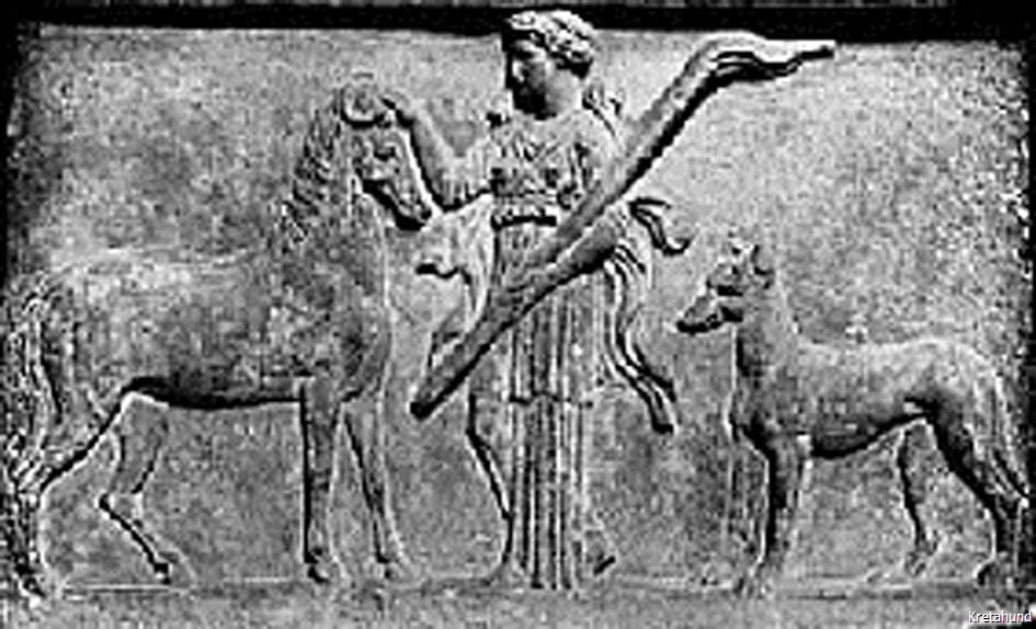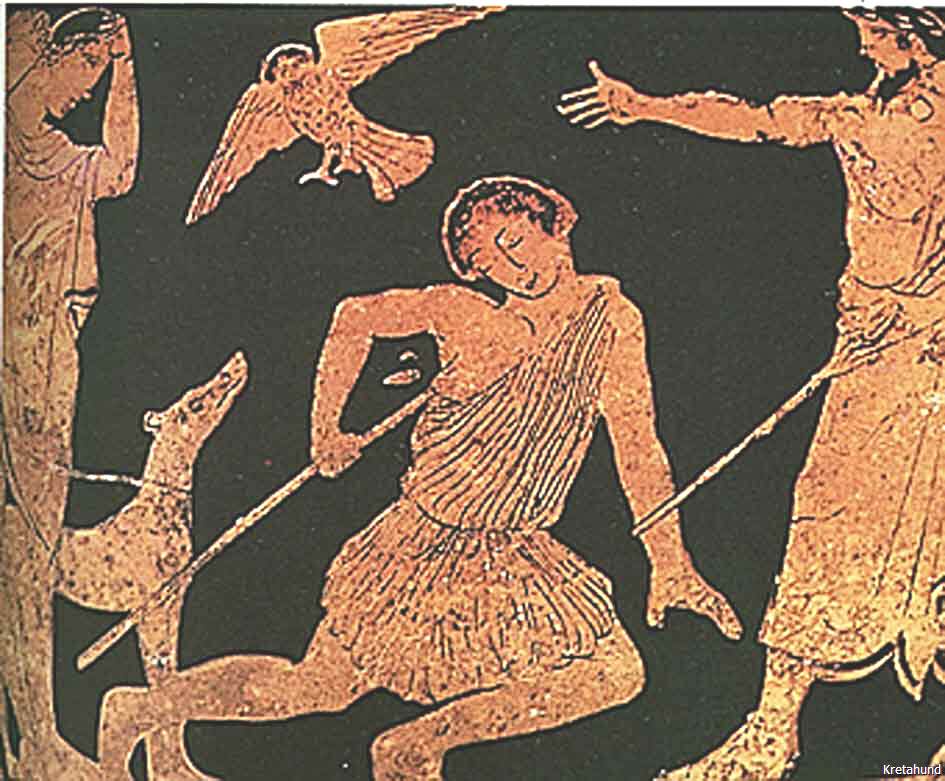Artemis war die jungfräuliche Jägerin. Wer auch nur den Versuch machte, sie zu erobern, bekam ihre Rache zu spüren. So wurde der kretische Jäger Siproites in eine Frau verwandelt, nachdem er Artemis beim Baden beobachtet hatte. Für das gleiche Vergehen wurde Aktaion, der vom Kentauren Chiron zum Jäger erzogen worden war, von der Göttin in einen Hirsch verwandelt. Sie hetzte seine eigenen fünfzig Jagdhunde auf ihn, die ihn in Stücke rissen. Der Dichter Ovid nennt uns in seinem Gedicht über Aktaion Namen und Herkunft der Hunde: Der weise Ichnobates (Spürhund), ein Kretischer Jagdhund; Melampus (Schwarzfuß), aus Spartischer Zucht; Dorceus, Pamphagus und Oribasos aus Arkadien; Nebrophonos, Theron, Lailaps und Pterelas sind unübertroffen in ihrer Schnelligkeit; Agre (Jäger) zum Aufspüren; Hylaeus (Waldmann), kürzlich von einem Bären verwundet; Nape, eine schlanke Hündin, deren Vater ein Wolf war; Poemenis; Harpyia Sicyonius; Ladon; Dromas; Canache; Tigris; Sticte; Alce; Asbolos; Leucon; Lycisce; Cyprius; Lacon; Aello; Thoos; Melaneus; Harpalos; Labros und Argiodus hatten einen Kretischen Vater und eine Spartische Mutter; Hylactor; Melanchaetes; Theridamas; Oresitrophus und einige mehr.
