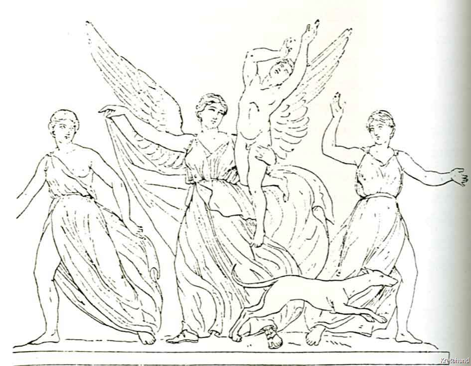 Obwohl Zeus mit seiner Schwester Hera vermählt war, hatte er viele Liebschaften, sowohl unter den Göttinnen, als auch unter den sterblichen Menschen. Als er die schöne phönizische Prinzessin (oder Göttin) Europa traf, verwandelte er sich in einen imposanten weißen Stier und verleitete sie dazu, sich auf seinen Rücken zu schwingen. Sofort sprang er ins Meer und schwamm mit ihr nach Kreta. Am Strand von Matala angekommen, nahm er die Gestalt eines Adlers an und verführte sie unter der immergrünen Platane bei Gortys. Drei Söhne entsprangen dieser Verbindung: Minos, Sarpedon und Rhadamanthis, die sich als Könige die Herrschaft über die Insel Kreta teilten, und Zeus machte seiner Geliebten Europa zum Abschied drei Geschenke. Er überließ ihr den Wächter Kretas, den Riesen Talos, der aus Erz gefertigt war und dessen Name in der alten Kretischen Sprache die Sonne bedeutete, und schenkte ihr einen Speer, der niemals sein Ziel verfehlte. Die dritte Gabe des Gottes an Europa war ein goldener Kretischer Jagdhund, von dem es hieß, daß seine Beute ihm niemals entkam. Er war ein Wunderwesen, in der Werkstatt des Schmiedegottes Hephaistos entstanden und hatte die Wiege des Zeuskindes und später sein Heiligtum bewacht.