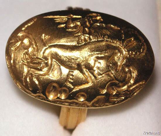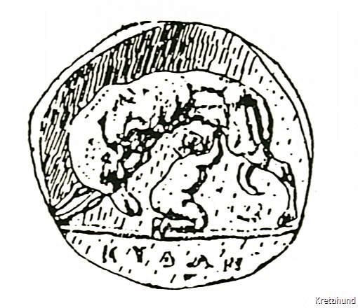 Daß der Hund im alten Kreta von großer Bedeutung war, wird nicht nur durch die Überlieferung der Mythen und durch die zahlreichen Abbildungen belegt, sondern auch durch einen aufsehenerregenden Fund von Hundeskeletten in Roussolakos bei Palaikastro auf Kreta. Hier befand sich in minoischer Zeit die größte Siedlung Kretas, Elia, und eines der wichtigsten Heiligtümer des Diktäischen Zeus, in dem man den Siegelabdruck des "großen Jägers" ausgrub. Es zeigt einen Jäger mit zwei Hunden bei der Jagd auf eine Wildziege. Mythologisch repräsentiert er die Constellation Orion - Canis major - Canis minor. Die Britsh School of Archaology fand auf dem Gelände zwei ausgetrocknete Zisternen, die u.a. 28 vollständig erhaltene Hundeskelette aus der Zeit von ca. 1450 v. Chr. enthielten. Wie uns der leitende Archäologe Alexander MacGillivray erklärte, läßt sich an der Art ihrer Bestattung erkennen, daß ihnen große Verehrung zuteil wurde. Für die Minoer waren sie heilige Tiere, denn sie halfen bei der Jagd auf die Tiere, die der Gottheit geopfert wurden, Hasen und Wildziegen.