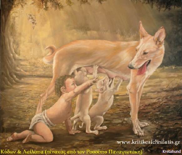 Auch in der neueren Mythologie Kretas spielt der Hund eine tragende Rolle. Die heutige Stadt Chania hieß früher Kydonia, benannt nach dem König Kydon (oder Kydonas), von dem sie der Legende nach gegründet wurde. Kydon, Kyon oder Kynos waren die altgriechischen Wörter für Hund. Die Mutter von Kydon war eine Göttin, die das Kind gleich nach der Geburt einem Hirten überließ (oder in den Bergen aussetzte). Dieser zog das Kind groß, indem er es von einer Kretischen Jagdhündin säugen ließ. Auf einigen alten Münzen aus Kydonia ist diese Szene abgebildet.