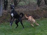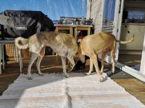 Als wir 2007 unsere Hündin Synnefia bekamen, war eigentlich klar: Wir möchten auch eines Tages einen Wurf Kritikos Lagonikos - Welpen aufziehen. Den passenden Rüden hatten wir bereits, Dhias (Krikyon Apollon) war in Griechenland für die Zucht anerkannt. Nachdem auch Synnefia ihre Anerkennung hatte, und einem Zuchtvorhaben eigentlich nichts mehr im Wege stand, beantragte ich 2011 als Mitglied des Deutschen Windhundzucht- und Rennverbandes DWZRV im VDH den nationalen Zwingerschutz und auch den internationalen Zwingerschutz für alle Rassen bei der FCI. Der Name unserer Zuchtstätte war schnell gefunden: "vom Nordwind" sollte sie heißen. Da der Nordwind in Griechenland "Vorias" heißt (Βοριάς) und für eine griechische Hunderasse natürlich nur ein griechischer Zwingername infrage kommt, wurde es also "του Βοριά", oder in lateinischen Buchstaben: "tou Voria". Leider hatten wir nicht das Glück, Nachwuchs von Synnefia und Dhias zu bekommen. Synnefia ließ sich von Dhias, mit dem sie in unserem kleinen "Rudel" aufgewachsen war, nicht decken. Ein anderer Rüde stand uns nicht zur Verfügung. Als Dhias dann 2014 plötzlich nach einer Milzruptur verstarb, mußten wir die Hoffnung auf Welpen aufgeben. Aber nun haben wir Fouria - und in Deutschland gibt es einen perfekt geeigneten Rüden: Zicko, geboren in Koutsouras im Osten Kretas, Besitzerin Svea Winter in Hannover! Beide Hunde haben mittlerweile ihre erforderlichen Formwerte auf Ausstellungen erlaufen, Zicko ist sogar schon Deutscher Champion VDH. Zicko wurde 2020 im DWZRV gekört, Fouria 2021. Mitte Dezember war es dann soweit - die beiden "Verlobten" hatten ihr erstes richtiges Date. Wie es bei so ursprünglichen Hunden nicht anders zu erwarten war, klappte es ohne Probleme, auch das Nachdecken zwei Tage später.