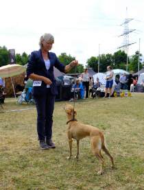 Auch in diesem Jahr nahmen wir an der German Winner Show des VDH in Gelsenkirchen teil, die wieder im Windhundstadion Emscherbruch stattfand. Die Rasse Kritikos Lagonikos wurde am Sonntag, dem 27. Juli 2025 von Klaus Strack gerichtet. Außer Antara in der Championklasse hatte er einen Rüden in der offenen Klasse zu bewerten: "Quality Hounds Aiantas" ist im November 2024 aus Kreta nach Deutschland importiert wurden, seine Züchter Maria Bouchlaki und Nikos Anetakis haben diesen wertvollen jungen Rüden wegen bereits vorhandener Nachzucht vertrauensvoll in die Hände von Sandra und Oliver Giesinger gegeben. Er konnte mit der Bewertung Vorzüglich 1 als bester Hund der Rasse den Titel German Winner 2025 erringen und bekam die Anwartschaft auf den Deutschen Schönheitschampion CAC. |
