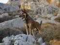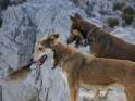 Die Hasenjagd auf Kreta stellt aufgrund der extremen Geländeverhältnisse und des Klimas besonders hohe Anforderungen an die Hunde. Die Härte und Schärfe, die sie dabei an den Tag legen, steht in krassem Gegensatz zu ihrem sonstigen Verhalten. Während der Jagsaison von Mitte September bis in den April fahren die Jäger mit einem oder zwei Hunden in abgelegene Gebirgsregionen. Gelegentlich werden zusätzlich junge Hunde zur Ausbildung mitgenommen. Die Jagd beginnt im Morgengrauen und dauert viele Stunden, oft bei Temperaturen um die 40°. Die Hunde jagen mit allen Sinnen. Der Jäger postiert sich meistens auf einem Felsen und kann von dort seine Hunde, die immer wieder Blickkontakt mit ihm aufnehmen, durch optische und verbale Signale aus großer Entfernung führen. Sie suchen mit der Nase die Spur des Hasen, der sich in Felsspalten oder im Dornengestrüpp versteckt. Dabei verfolgen sie ohne Spurlaut die frischeste Fährte, die direkt zum Versteck des Hasen führt. Die Hunde arbeiten ruhig und leise, sie dürfen bei aller Jagdmotivation nicht hektisch werden, sondern müssen sich konzentrieren, um keine Energie zu verschwenden. Die trockene Witterung, die hohen Temperaturen und der oft sehr starke Wind erschweren das Auffinden der Beute, da die Duftmoleküle, vor allem auf dem kahlen Fels, rasch zerstört werden. Ein großes Problem stellt auch der Staub dar, den die Hunde zwangsläufig mit der Nase aufnehmen und der somit Geruchssinn und Atmung beeinträchtigt und die Hunde zu häufigem Niesen zwingt. Der Kritikos Lagonikos verfügt jedoch über eine Jagdtaktik, die von den Kretern "Anemistos" genannt wird. Es bedeutet "mit dem Wind - Erfassen der Luft". Dazu bleiben die Hunde stehen, nehmen die Nase hoch, stellen sich manchmal auch auf die Hinterbeine und bewegen sich gegebenenfalls im Kreis. Sie saugen den Geruch der Beute mit Nase und oft leicht geöffnetem Fang ein und orten so die Beute. Man kann gut sehen, wie sie dabei die "Backen aufblasen" und den Geruch regelrecht "kauen". Eine weitere erfolgreiche Taktik besteht im Belecken des Untergrundes, um die wenigen noch vorhandenen Reste der Fährte besser aufnehmen zu können. Am lebhaften Rutenspiel der Hunde erkennt der Jäger, wenn sich die Beute in unmittelbarer Nähe befindet. Mit gespitzten Ohren lauschen sie auf jede Regung ihres Opfers. Währenddessen kommunizieren die Hunde über ihr Rutenspiel miteinander, und das plötzliche Erstarren eines Hundes, mit hoch aufgeringelter Rute, zeigt dem Jäger, daß das Versteck gefunden wurde. Wenn der Hase aufgejagt worden ist, beginnt die Hatz über scharfkantige Felsen und dornigem Bewuchs, wobei kurz der "Kampfschrei", ein hohes Bellen, zu hören ist. Dabei vollführen die Hunde atemberaubende Sprünge und Wendungen, um dem hakenschlagenden Hasen den Weg abzuschneiden. Oft müssen tiefe Schluchten und meterhohe glatte Felswände überwunden werden. Mit Eleganz und Leichtigkeit bewegen sich die Hunde in dem schwierigen Gelände und erreichen dabei auf kurzen Distanzen Geschwindigkeiten von ca. 70 km/h. Die Hunde arbeiten miteinander und die Erfahrung lehrt sie "wie der Hase läuft". Wenn es ihnen nicht gelingt, den Hasen auf den ersten 100 metern im Lauf zu packen, verfolgen sie ihn noch ca. 500 bis 1000 meter und kehren dann zum Jäger zurück. Die Hunde wissen aus Erfahrung, dass ihre Chancen mit der Entfernung geringer werden und begeben sich auf eine neue Suche. Wenn ein Hund die Beute gefasst hat, apportiert er sie seinem Herrn, ohne daß die anderen Hunde versuchen, sie ihm streitig zu machen. Die traditionelle Jagdweise ohne Gewehr ist heute nicht mehr erlaubt. Die Jäger müssen über viel Erfahrung und gutes Timing verfügen, um den Hund beim Schuß nicht zu verletzen, da dieser sich sehr nah hinter der Beute befindet, und oft hat der Hund den Hasen bereits gefangen, bevor der Jäger die Möglichkeit zum Schuß hat. |